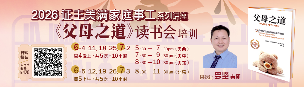 证主家庭事工 2026年罗坚老师《父母之道》读书会带领人培训 美滿家庭学堂 2026年3月31日2026年3月31日 No Comments 大陆地区报名 时间:6/4,6/11,6/18,6/25,7/2周四晚7-9pm(美中) 北京时间次日周五上午 […]