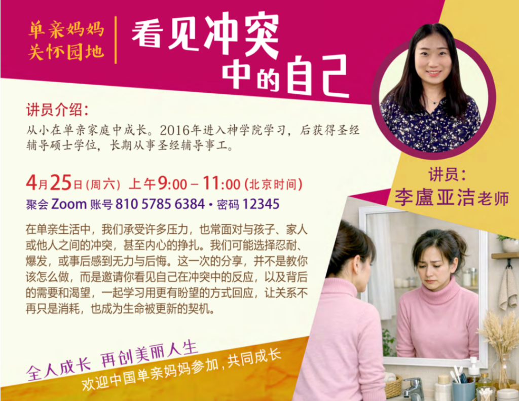 无论您是单亲妈妈,还是关怀单亲妈妈群体的的姊妹,都欢迎加入这个充满力量与爱的讲座,让我们共同发现单亲生活中的希望与美好!