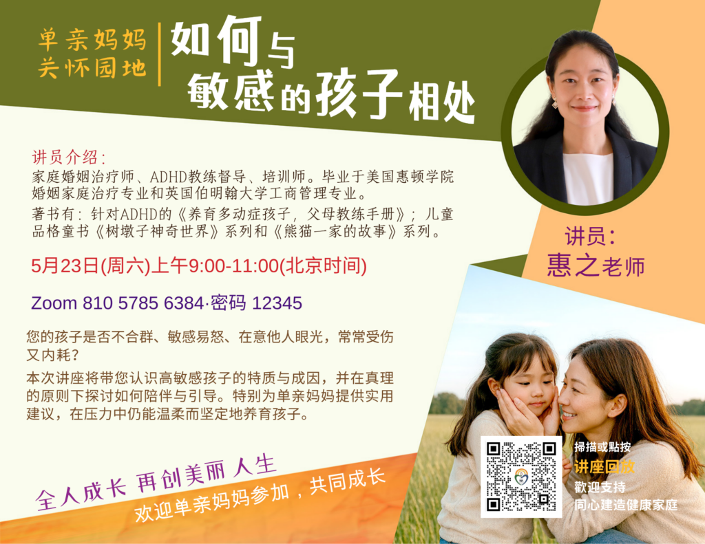 无论您是单亲妈妈,还是关怀单亲妈妈群体的的姊妹,都欢迎加入这个充满力量与爱的讲座,让我们共同发现单亲生活中的希望与美好!